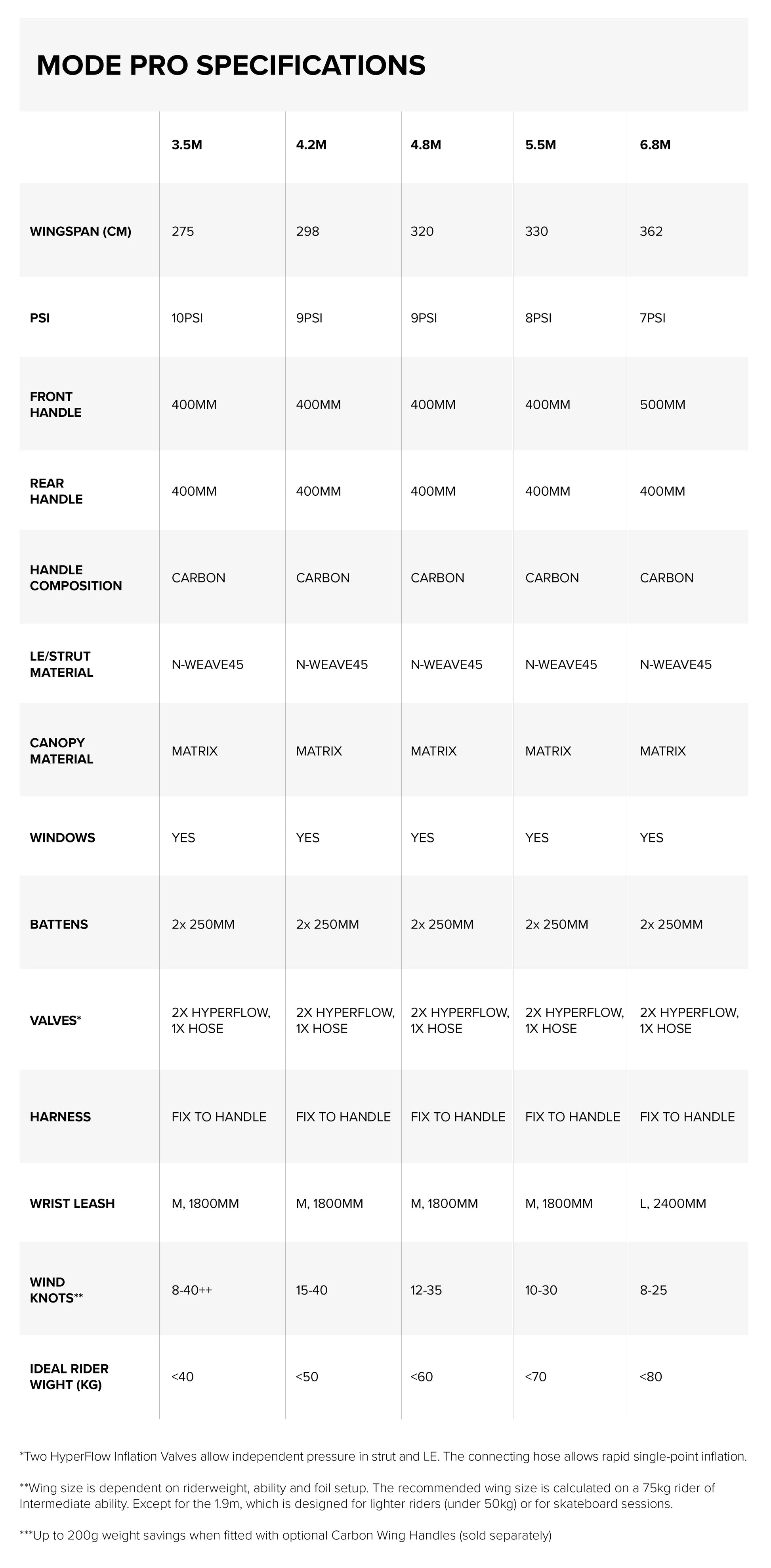 A wing piacon eddig nem látott mértékben lehet túlvitorlázni, a 3.5-4.8 közötti méretek kiválóak a nagyszeles wingezésre, míg az 5.5-6.8 közötti ernyők sokkal jobb low-enddel (kisszeles tulajdonsággal) rendelkeznek.