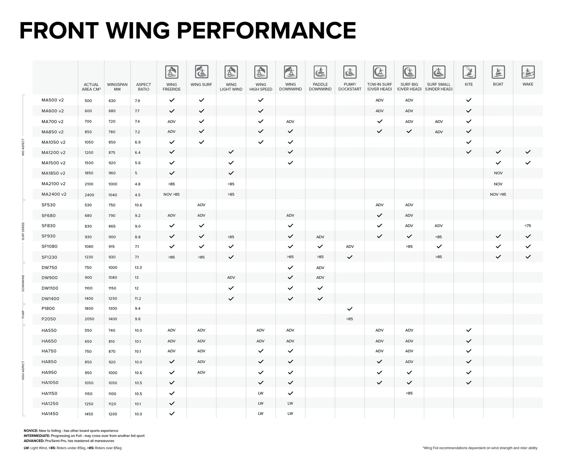 A P, mint Pumpfoil széria két front winget tartalmaz : egy 1800 és egy 2050 cm2 felületű szárnyat. A kisebbet a 85 kiló alatti ridernek, míg a nagyobbat az e fölötti ridereknek találták ki.